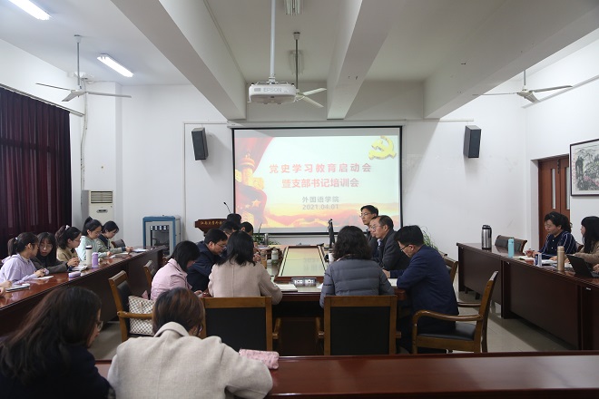 2021年是中國(guó)共產(chǎn)黨成立100周年,也是“十四五”規(guī)劃的開局之年,站在“兩個(gè)一百年”奮斗目標(biāo)歷史交匯的關(guān)鍵節(jié)點(diǎn),在全黨集中開展黨史學(xué)習(xí)教育,重溫黨的光輝歷程,具有重大的意義。4月1日,外國(guó)語學(xué)院召開了黨史學(xué)習(xí)教育啟動(dòng)會(huì)暨黨支部書記培訓(xùn)會(huì),對(duì)學(xué)院的黨史學(xué)習(xí)教育工作進(jìn)行了動(dòng)員部署,并對(duì)基層黨建工作進(jìn)行專題培訓(xùn)。校黨委組織部副部長(zhǎng)耿向陽、學(xué)院黨委委員、教工及學(xué)生黨支部全體支部委員參加會(huì)議,劉伯賢主持會(huì)議。