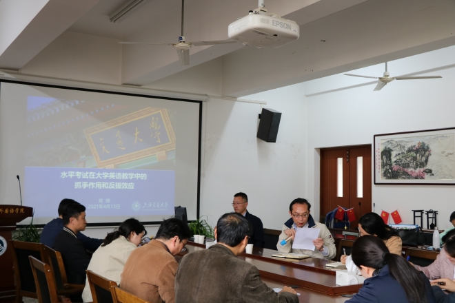 4月13日,我院2021外語學(xué)科系列講座暨第十三期“遇見更好的自己”名師沙龍在學(xué)院A349會議室舉行。本次會議邀請上海交通大學(xué)外國語學(xué)院教授、博士研究生導(dǎo)師、常務(wù)副院長常輝教授,詳細(xì)講解水平考試在大學(xué)英語教學(xué)中的抓手作用。講座由外國語學(xué)院方文開院長主持,三十余名外國語學(xué)院教師參與其中。