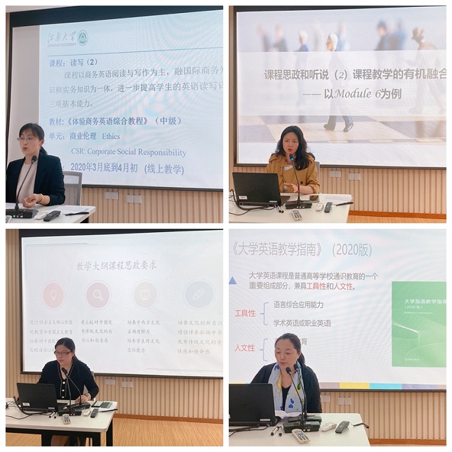 接著,拓展部四位老師結合《讀寫2》、《聽說2》、《翻譯1》、《翻譯2》等具體課程分享了如何發掘大學英語課程的思政元素,并將課程思政的理念具體融入到大學英語教學實踐和教學設計全過程,老師們的精心準備與熱情分享了贏得了在場教師的熱烈掌聲。分享結束后,老師們結合分享的優秀舉措,以課程組的形式就各自課程教學中的思政教育進行了深入交流。