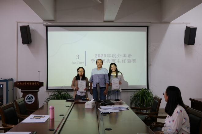 在2020年度外國語學院班主任工作中,徐燕娜、華清、謝瑜三位老師榮獲“升學優秀獎”,張良青老師榮獲“優秀學風獎”。頒獎后劉書記號召學院班主任老師向他們學習,主動提升工作方式方法,不斷增強班主任工作能力和工作成效。