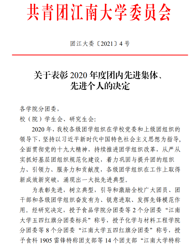 近日,共青團(tuán)js3333線路檢測中心委員會下發(fā)《關(guān)于表彰2020年度團(tuán)內(nèi)先進(jìn)集體、先進(jìn)個人的決定》(團(tuán)江大委〔2021〕4號),對2020年度做出突出貢獻(xiàn)和成績的一批先進(jìn)集體與個人進(jìn)行表彰,我院分團(tuán)委被評為2020年度“js3333線路檢測中心五四紅旗分團(tuán)委”。