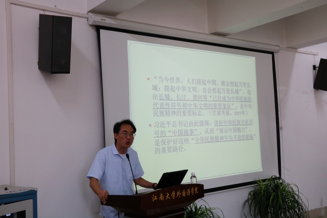 陳偉教授首先從傳播學(xué)跨學(xué)科的角度,基于以習(xí)近平同志為核心的黨中央提出的高度重視文化建設(shè)的指示,介紹了中華文化符號的傳播意義和價值,明確了外語人應(yīng)該具備何種敏感性樹立、何種全球觀,通過文化符號,傳播優(yōu)秀文明。