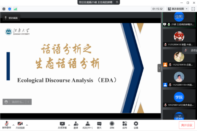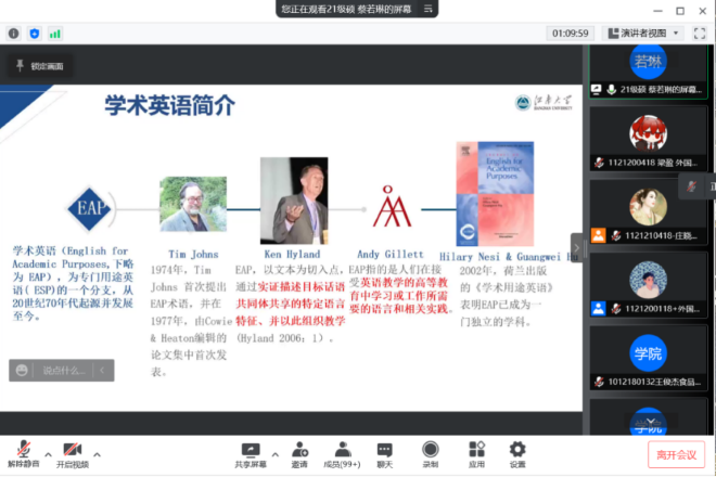 最后,李老師請兩位研究生學姐為參會同學介紹探討了系統功能語言學分別在學術英語、生態話語分析(EDA)中的應用。