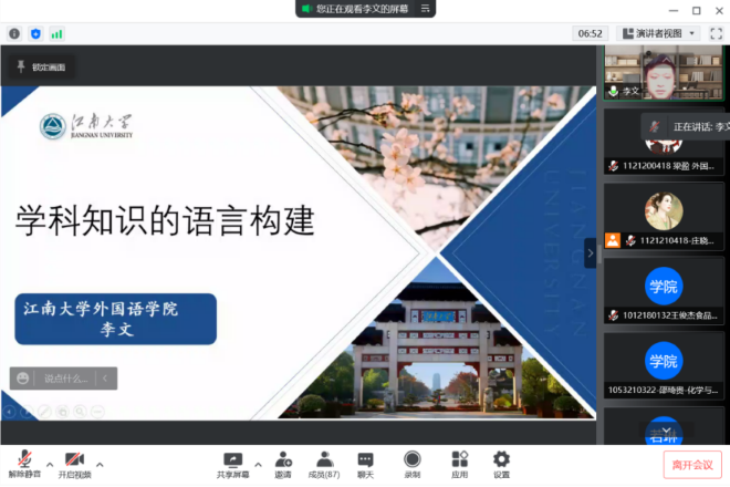 4月13日下午,第五期Sharing Space邀請外國語學院李文副教授線上主講“學科知識的語言構建”主題分享圓桌會,會議持續一個小時左右,吸引各學院百余位同學的參與。會議由外國語學院學生會莊曉宇同學主持。