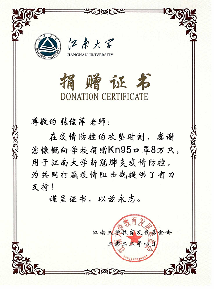 校教育發展基金會為張俊萍老師頒發了捐贈證書,校疫情防控工作領導小組辦公室專門給張老師發來了感謝信。張老師捐贈的這批口罩為學校打贏疫情防控阻擊戰提供了有力支持,為疫情防控和校園安全提供了重要物資保障,對學校落實疫情防控四方責任作出了貢獻。