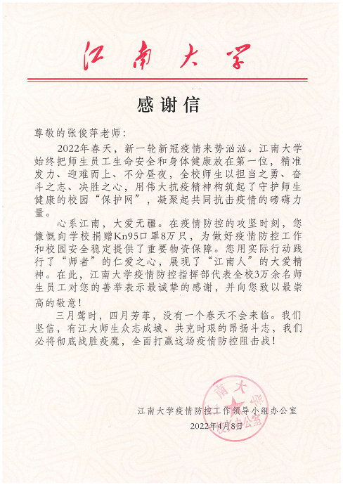 張老師回憶到,上海封城后,無錫防疫形勢吃緊,本想著趕緊為封在校內的師生聯系一點物資,沒想到外地企業4月初已經暫停江浙一帶的貨運服務。經多方尋找,終于在4月6日聯系到承運司機。更沒想到的是,無錫高速已經實行嚴格的交通管制,司機在高速上等候了一天一夜,直到4月7日晚,口罩才得以送到學校,在這特殊時期,所有人共同努力,實屬不易!談到這一善舉時,張老師表示,江大是全體師生的家,緊急情況下為“家”著想是很自然的事,而她,只是做了一件每一位黨員教師都可能會做的事!