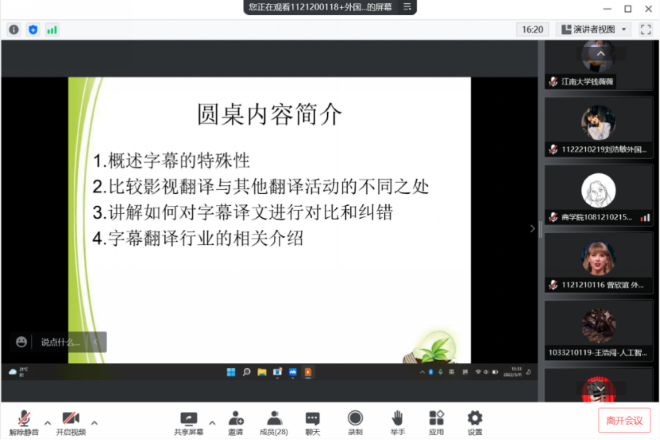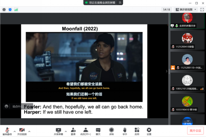5月11日13時,外國語學院主題系列活動第十期“Sharing Space”邀請外國語學院金波老師線上進行“影視字幕介與談”主題圓桌會,會議持續90余分鐘,吸引來自外國語學院、設計學院、人文學院、商學院等同學參與,會議由外國語學院學生會黃俊秀同學主持。