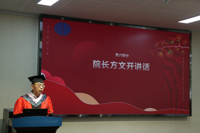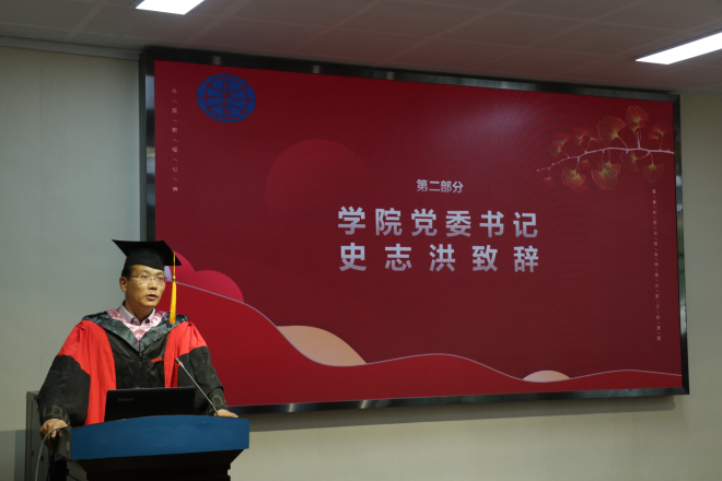 典禮伊始,學院黨委書記史志洪致辭。史志洪首先代表學院黨委向全體畢業生表示熱烈的祝賀和美好的祝福,向老師與家長致以崇高的敬意和衷心的感謝,并對同學們提出了三點希望:一是胸懷大局,不斷增加人生的高度。二是求真務實,不斷增加人生的寬度;三是追求卓越,不斷增加人生的厚度。最后祝愿所有畢業生們揚帆起航,開啟美好新征程。