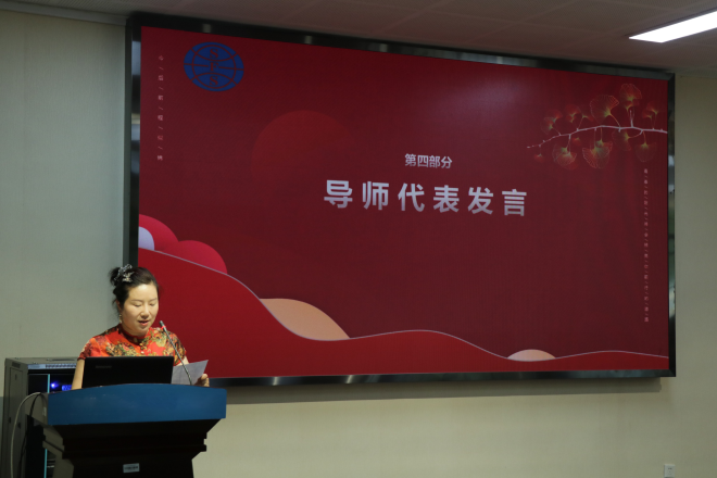 導師代表張俊萍表達了對同學們的美好祝福和殷切期望。張老師表達了三個愿景:一愿畢業生們一往無前地放眼世界,擁抱世界;二愿畢業生們勇敢地扛起家庭責任,扛起幸福擔當;三愿畢業生們在艱難的拼搏中原諒生活,熱愛生活。最后送給同學們路易斯·格麗克End of Winter中的一句詩作為結語,希望同學們不忘初心,逐夢遠航。