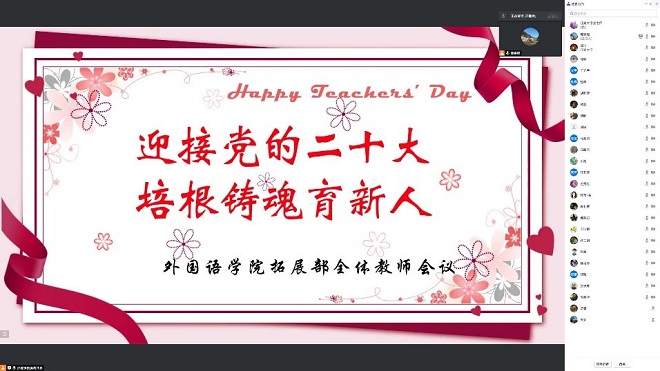 在第38個教師節來臨之際,外國語學院大學英語拓展部全體教師于9月8日下午2點,相聚云端,以 “迎接黨的二十大,培根鑄魂育新人”為主題,進行了立德樹人研討活動。外國語學院副院長謝競賢老師出席了本次研討,支部書記邢嘉鋒老師主持了本次研討會。
