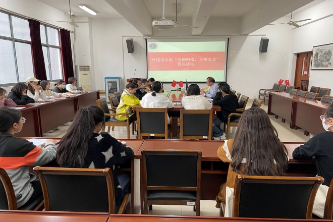 網絡空間是我們共同的精神家園,網絡文明也成為精神文明建設的重要組成部分。10月5號下午,外國語學院“清朗網絡,文明有我”活動在學院A349舉行,外國語學院黨委副書記劉伯賢,輔導員苗文建以及各班宣傳委員參加本次活動。