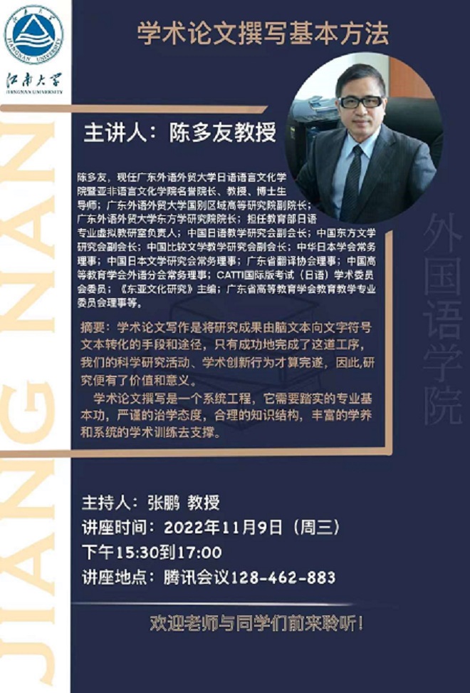 11月9日下午,教育部外國語言文學教學指導委員會日語分委員會委員、廣東外語外貿大學東方研究院院長陳多友教授應邀為我院師生做了題為“學術論文撰寫基本方法”的線上專題講座。講座由日語系主任張鵬教授主持。