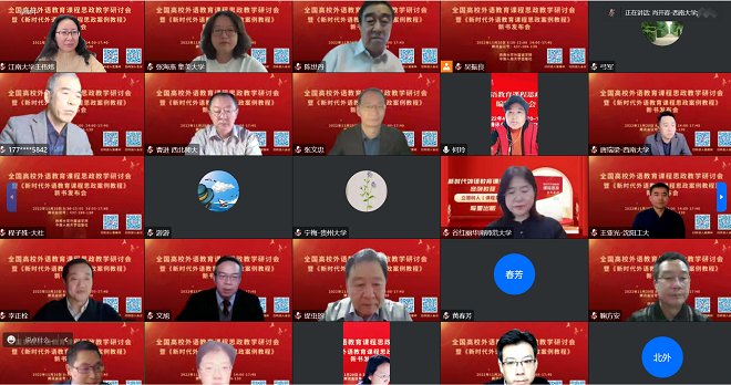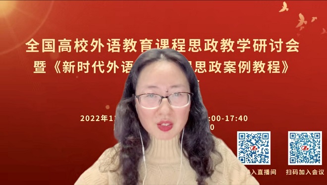 2022年11月20日全國高校外語教育課程思政教學研討會在線召開。本次會議由西南大學外國語學院和中國人民大學出版社主辦,來自全國各地共2000多位高校外語教師參加。會議共有4個主題報告,8個案例分享。我院大學英語教師王偉煒應邀做大會發(fā)言,分享了《大學英語視聽說》課程思政教學設計樣例。這是本次會議上唯一一個入選分享的大學英語課程思政教學案例,受到了與會專家與教師的廣泛好評。本次分享也是我校大學英語課程思政建設工作第二次在全國外語界公開展示,發(fā)揮了良好的示范與輻射效應。