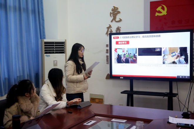 英語本科生黨支部書記孫康杰、日語本科生黨支部書記魯穎潔、翻譯方向研究生黨支部書記馬仁芳、文學方向研究生黨支部書記張羽潔、語言學方向研究生黨支部書記劉澍蕾5位同志借助PPT詳細地從個人履職情況、支部組織建設、組織生活開展情況等方面總結匯報了過去一年支部黨建工作的成果以及存在的不足,并提出了下一年整改落實思路和具體措施。