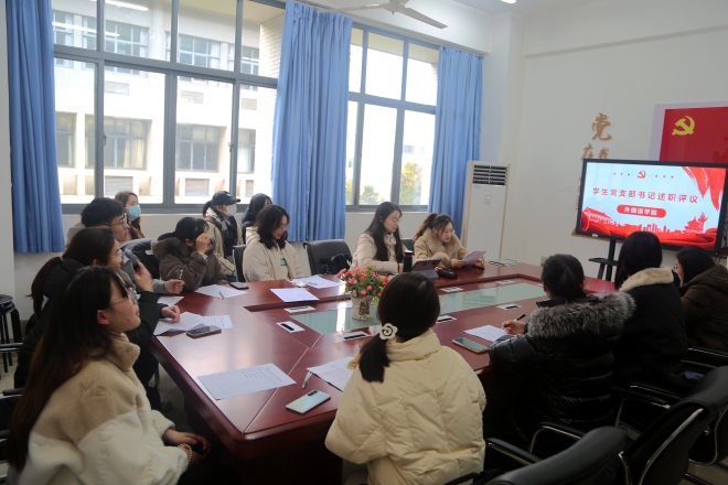 為總結2022年外國語學院學生黨建工作,同時更好的學習宣傳貫徹黨的二十大精神,2022年12月1日下午2點,外國語學院在A331會議室開展2022年度學生黨支部書記述職評議考核工作。學院黨委副書記劉伯賢、分團委書記陸芳、5個學生黨支部的支部書記、黨員代表參加了此次會議。