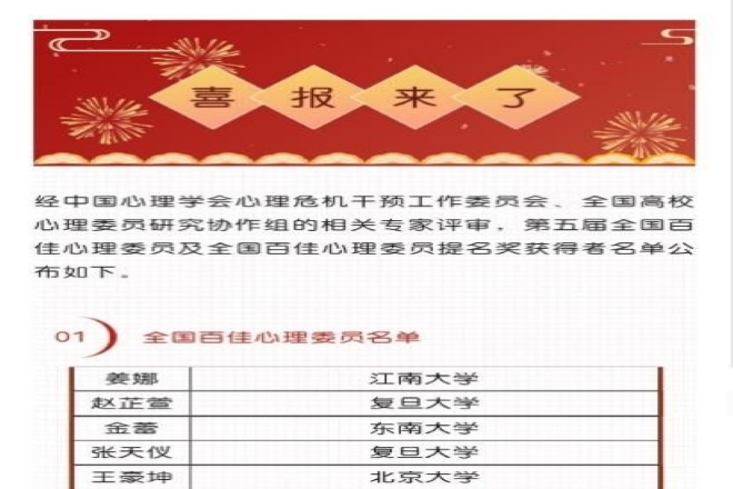 此次全國百佳心理委員的評選通過學校推薦、個人事跡網絡展示及投票、專家評分等環節產生。不負眾望,我校推薦的姜娜同學沖出500名選手的重圍,榮獲“全國百佳心理委員”稱號,更是奪下僅14個名額的心理論壇副主席一職。這是js3333線路檢測中心歷史上第一次在此類賽事上斬獲殊榮。姜娜同學一馬當先,為js3333線路檢測中心摘得這項榮譽,增光添彩。姜娜同學的獲獎,不僅是對她個人的肯定,也是對外國語學院以及我校心理委員隊伍建設工作的認可。