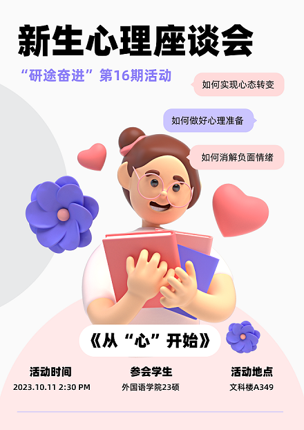 10月10日是第32個世界精神衛生日,為進一步開展心理健康教育工作,促進外國語學院研究生新生的成功轉型,幫助2023級研究生開好頭、起好步,2023年10月11日下午15點30分,外國語學院“研途奮進”第十六期活動在文科樓A349成功舉行。2023級全體碩士研究生及部分2022級碩士研究生參與了本次活動。此次活動的主題是“從‘心’開始”新生心理座談會,共分為兩個環節:學姐經歷分享以及趣味心理小測試。