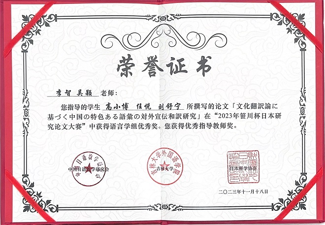 組三等獎,21級學生高小博、任悅、劉舒寧三位同學獲得語言組優秀獎。日語系劉建華老師、李智老師、吳穎老師分別榮獲“優秀指導教
