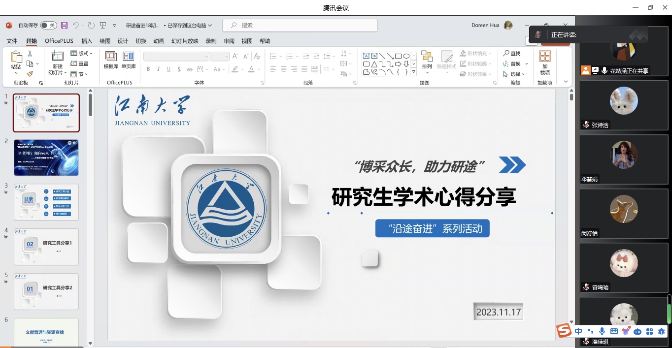 2023年11月17日19:00,外國語學院“研途奮進”第十一期活動在騰訊會議平臺成功舉行,本次活動主題為“博采眾長,助力研途”學術生活心得分享會。22、23級碩士研究生線上參與了本次活動。