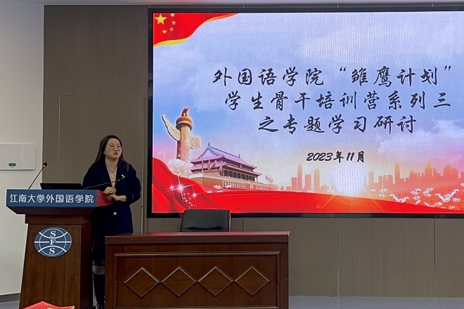 為進一步學習貫徹習近平新時代中國特色社會主義思想和黨的二十大精神,認真落實習近平總書記關于青年工作的重要思想,加強團學骨干隊伍建設,外國語學院分團委于2023年11月30日下午在君金報告廳開展了“雛鷹計劃”團學骨干培訓營之專題學習研討活動。參與本次活動的有馬克思主義學院副教授周赟博士、新發展黨員、團學骨干以及雷鋒特稱團支部全體團員。會議由分團委書記顧海星主持。