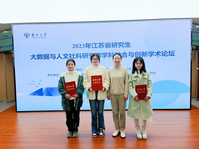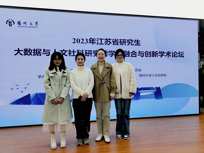 2023年12月9日,江蘇省研究生大數據與人文社科研究跨學科融合與創新學術論壇在揚州大學召開。本屆論壇由江蘇省文學類研究生教育指導委員會主辦,揚州大學承辦。來自省內10余所高校的49名碩博研究生與帶隊教師共同出席了本次學術論壇。我院2022級研究生王婷以及2023級研究生方漩和胡婷婷在謝競賢副院長的帶領下參加了本次論壇。
