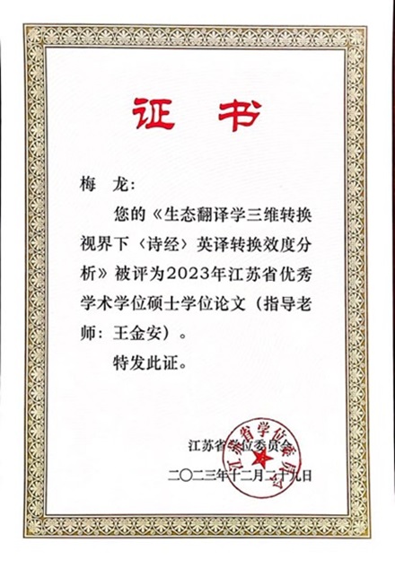 近日,江蘇教育廳發布2023年江蘇省優秀博士碩士學位論文評選結果,經培養單位初評推薦、研究生教指委復評、綜合評審暨專家委員會審定等評選程序,我院19級碩士研究生梅龍同學完成的碩士學位論文《生態翻譯學三維轉換視界下<詩經>英譯轉換效度分析》(指導老師:王金安)獲評2023年江蘇省優秀學術學位碩士學位論文。