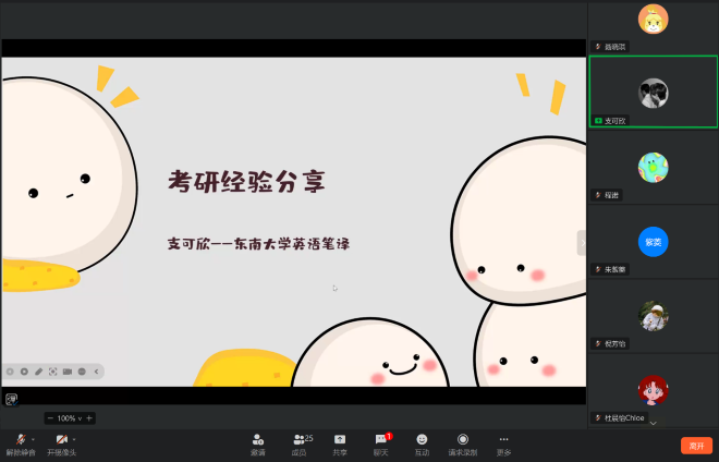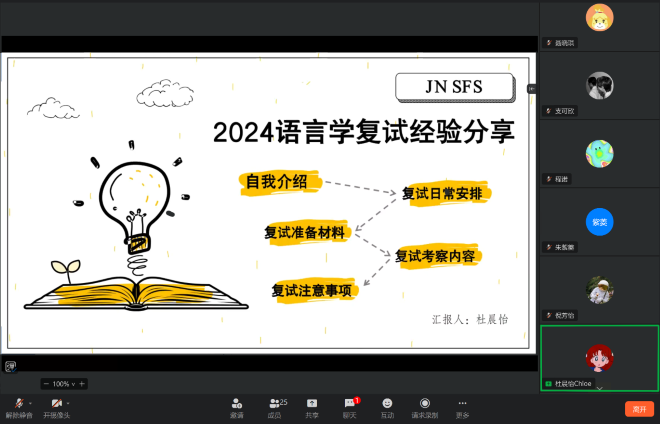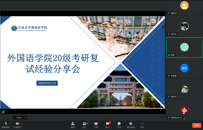 為幫助我院考研學生有針對性地進行復試準備,增強復試信心,3月13日18:30,外國語學院20級學生考研復試經驗分享會在線上舉行。本次分享會邀請到了我院研一學生杜晨怡、朱紫菱以及19級考研上岸的倪芳怡、支可欣,四位同學結合自己的復試經歷分享了心得和經驗。