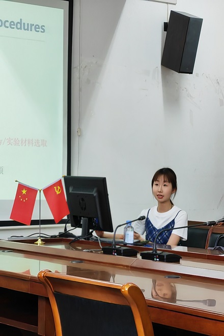 隨后,研二的鄧暄惠同學分享了自己開題報告的撰寫經驗。她從研究背景、文獻綜述、研究問題的確定和研究方法及實驗流程四個方面向同學們解讀了開題報告寫作的要求,并給研一同學開題前期準備和答辯過程提供了切實可行的建議。