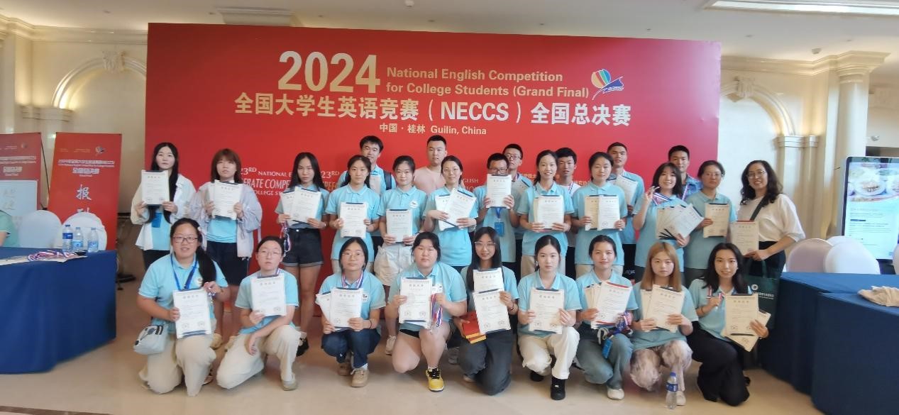2024年全國大學生英語競賽(NECCS)全國總決賽于2024年8月2日至6日在廣西桂林舉行。在外國語學院競賽指導教師團隊的悉心指導下,我校學子在比賽中充分發揮水平,再創新高,斬獲了多個高級別獎項。在演講比賽中,顧佳昊(食國2301)獲一等獎,馬心琰(英語2202)、孫奕穎(漢師2301)獲二等獎,方漩(英語語言文學23碩)、陳素潔(產品2202)、陳盈佐(會計2303)獲三等獎。在風采大賽中,顧佳昊、馬心琰、孫奕穎、方漩、陳素潔獲三等獎,陳盈佐獲優秀獎。孫奕穎和方漩被評為優秀參賽選手。方漩還被評為最佳主持人。