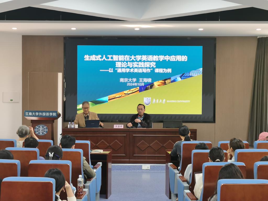 2024年10月30日下午,南京大學博士生導師、教育部高等學校大學外語教學指導委員會委員、全國大學英語四六級考試委員會委員、江蘇省高等學校外國語教學研究會會長王海嘯教授應邀蒞臨外國語學院,為我院師生作題為“生成式人工智能在大學英語教學中應用的理論與實踐探究”的講座。講座由js3333線路檢測中心方文開教授主持,外國語學院師生參加了講座。
