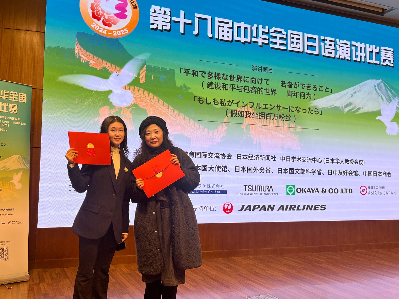 比賽分命題演講和即席演講兩部分。上午,選手們圍繞“建設和平與包容的世界——青年何為”“假如我坐擁百萬粉絲”兩個主題,開展了限時5分鐘的命題演講。選手們演講內(nèi)容貼近生活實際,抒發(fā)了真實感悟,用真誠打動觀眾,以演講注解心聲。下午為限時3分鐘的即興演講,選手們圍繞“人生計劃”的主題展開演講。即興演講考驗的是選手們的知識儲備量以及臨場應變能力,比賽更顯激烈、緊張。我校選手陳芯蕊以扎實的語言功底和較強的臨場應變能力獲得二等獎,中西由美子老師、崔明姬老師獲優(yōu)秀指導教師獎。