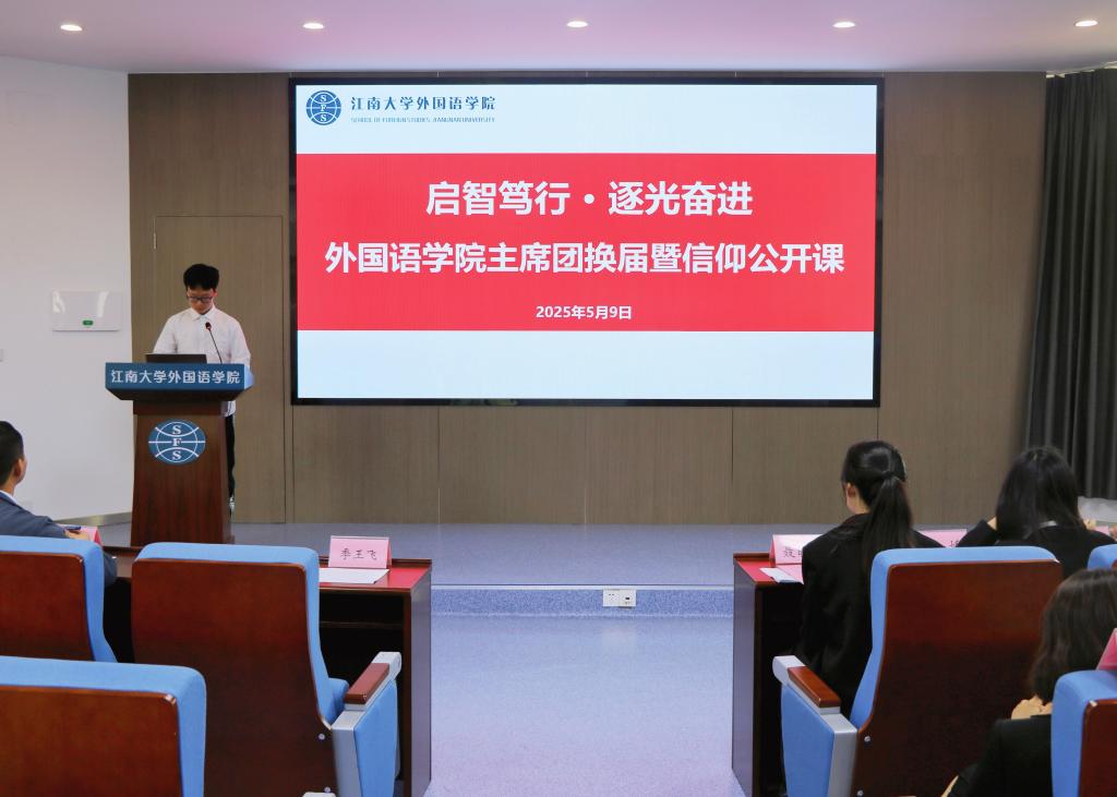 5月9日下午,外國語學院在君金報告廳舉行“啟智篤行·逐光奮進”外國語學院學生會主席團換屆暨信仰公開課,外國語學院黨委副書記、副院長季王飛,分團委書記、學工辦主任顧海星,輔導員苗文建老師參與本次活動。本次活動由徐源銘主持。
