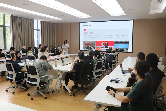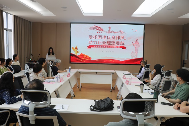 英語系黨支部書記謝瑜以“樣板賦能,推動學院和專業發展”為主題回顧了英語系黨支部創建樣板黨支部的各項工作,圍繞品牌活動、助力扶貧、學科融合三方面展示了支部積極探索黨建工作創新、“一融雙高”發揮外語人專長的豐富成果,并交流了下一階段支部建設的目標和規劃。