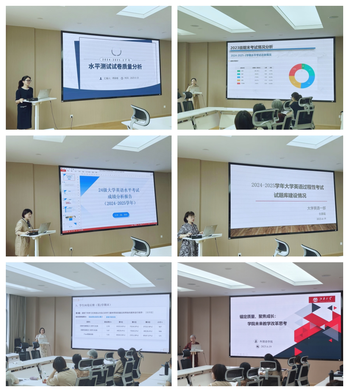 為全面總結本學期大學英語教學工作,深入分析教學質量,規劃未來改革方向,外國語學院于2025年6月19日在文科樓A349召開大學英語教學質量研討會。大學英語全體教師和相關課題組成員參會,學院黨委書記李榮華、分管教學副院長顧琦一出席,大英一部主任宣泠老師主持。會議就大學英語水平考試命題質量、期末考試分析、過程性考試評估、線上教學設計分享以及未來教育教學改革部署展開深入討論。