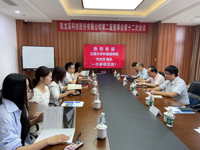凱龍高科技股份有限公司副總經(jīng)理、技術研究院院長劉德文,技術研究院副院長周穎,外貿(mào)業(yè)務部經(jīng)理歐小娟參加座談交流會。首先,外國語學院一行參觀了企業(yè)展廳。座談會現(xiàn)場,劉德文介紹了公司的發(fā)展歷程、主要產(chǎn)品、招聘情況等內(nèi)容,他表示,企業(yè)一直在拓展海外業(yè)務,需要高素質(zhì)語言人才,期待與外國語學院在實習就業(yè)、人才培養(yǎng)等方面展開合作。方文開介紹了學院的師資力量、學科建設、人才培養(yǎng)等基本情況,他表示,學院人才培養(yǎng)離不開企業(yè)的支持,希望以本次訪企拓崗為契機,雙方攜手開啟共贏共發(fā)展的新局面。季王飛介紹了學院2025屆畢業(yè)生就業(yè)情況,歐小娟介紹了公司海外業(yè)務發(fā)展情況。在交流環(huán)節(jié),大家圍繞“實習工作”、“招聘要求”、“人才培養(yǎng)”等方面積極發(fā)言。