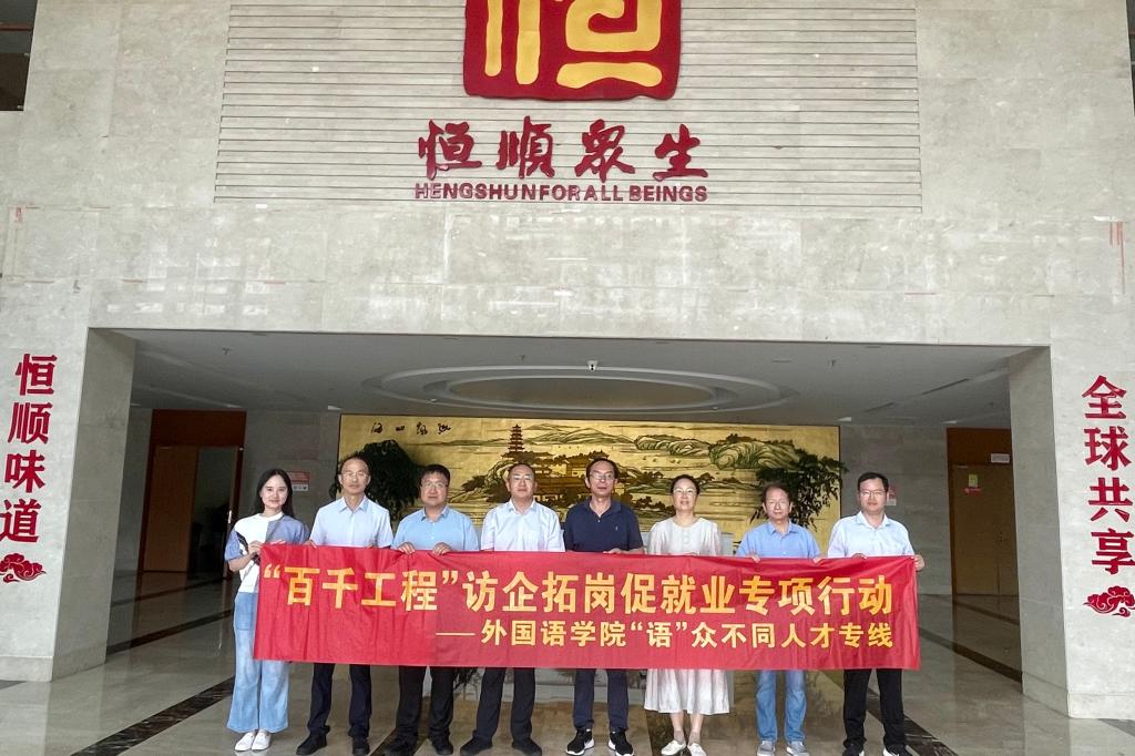 為進一步深化校企合作,提高學生對未來職業發展的認識,提高就業競爭力,7月15日下午,外國語學院赴江蘇恒順醋業股份有限公司開展訪企拓崗促就業專項行動。學院院長方文開,黨委副書記、副院長季王飛,副院長謝競賢,副院長楊勇,MTI主任李學寧,輔導員朱家燁參加本次走訪調研。