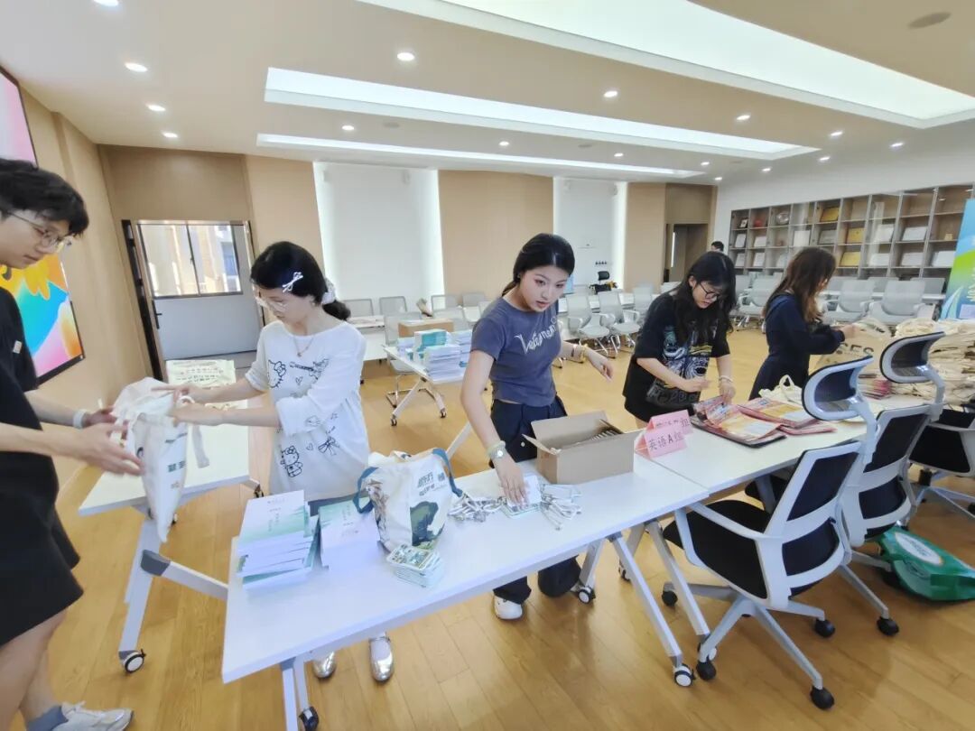 2025年8月29日,150名本科新生加入外國語學院大家庭,正式開啟四年大學時光。為營造溫暖有序的入學氛圍,在迎新的籌備現場,志愿者們緊鑼密鼓地籌備2025級新生迎新工作。志愿者化身“魔法師”,把對新生的期待與關懷,盡數裝進印有美好祝福的帆布袋中。有的同學在仔細檢查袋內是否配齊校園手冊與定制文創;有的俯身整理堆疊的資料,將其按類別謹慎規整。