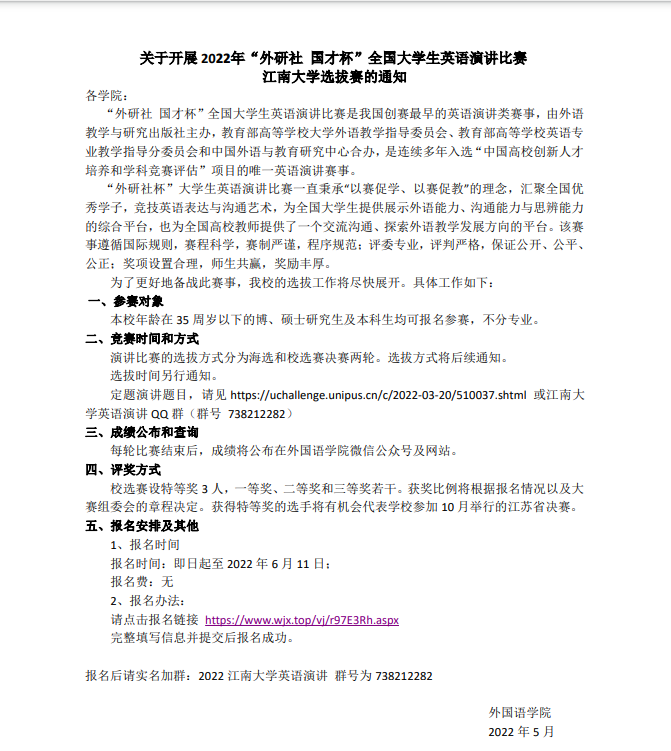 關(guān)于開展2022年“外研社 國才杯”全國大學(xué)生英語演講比賽js3333線路檢測中心選拔賽的通知