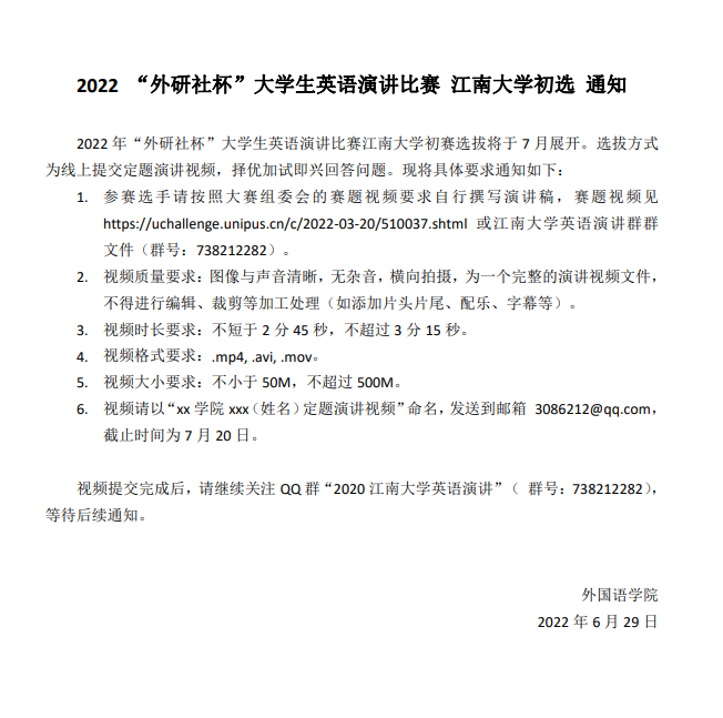 2022“外研社杯”大學(xué)生英語演講比賽js3333線路檢測中心初選通知