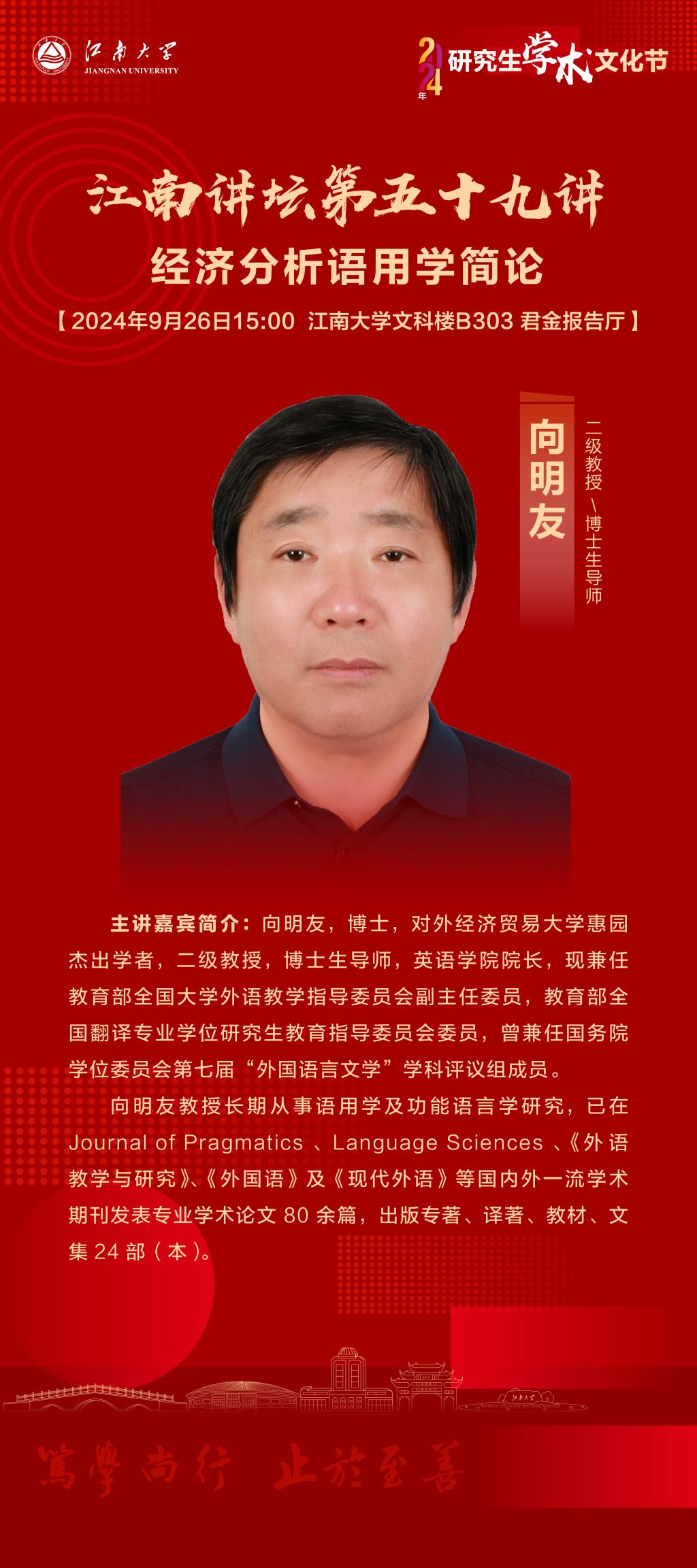 向明友,博士,對外經濟貿易大學惠園杰出學者,二級教授,博士生導師,英語學院院長,現兼任教育部全國大學外語教學指導委員會副主任委員,教育部全國翻譯專業學位研究生教育指導委員會委員,曾兼任國務院學位委員會第七屆“外國語言文學”學科評議組成員。向明友教授長期從事語用學及功能語言學研究,已在Journal of Pragmatics 、Language Sciences 、《外語教學與研究》、《外國語》及《現代外語》等國內外一流學術期刊發表專業學術論文80余篇,出版專著、譯著、教材、文集24部(本)。