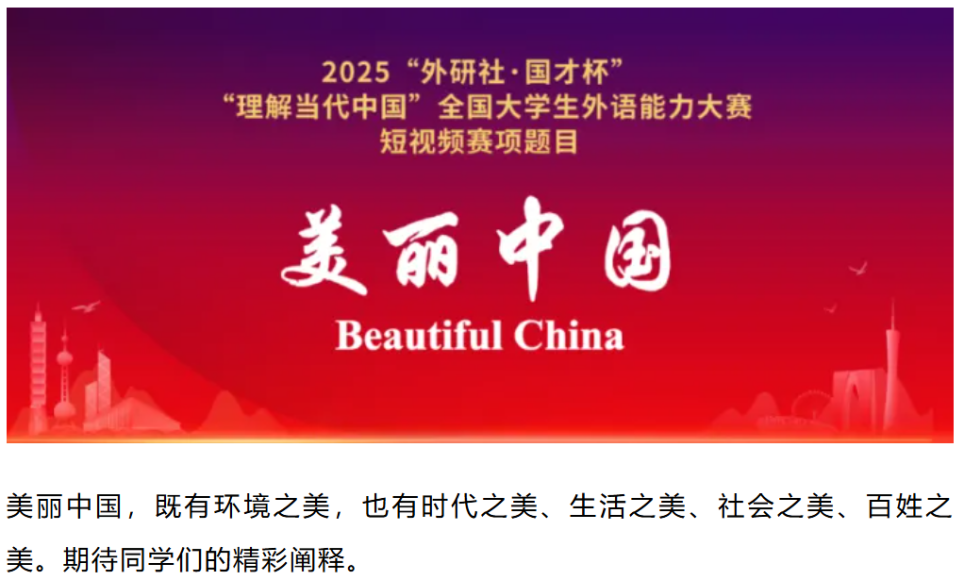 為深入貫徹黨的二十大精神,落實立德樹人根本任務,推動“三進”工作縱深發展,為國家培養更多有家國情懷、有全球視野、有專業本領的高水平國際化人才,為加強我國國際傳播能力建設、推動構建人類命運共同體提供人才支撐,在上級主管部門指導和支持下,2025“外研社·國才杯”“理解當代中國”全國大學生外語能力大賽將于2025年5月至12月舉辦。短視頻賽項為大賽下設分項。為了更好地備戰此賽事,我校的選拔工作將盡快展開。具體工作如下: