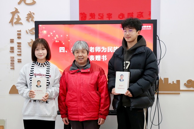 活動(dòng)中,鮑國慶向民族學(xué)生代表贈(zèng)送了英文版、日文版《習(xí)近平談治國理政》、《大學(xué)英語四六級(jí)真題》等書籍,并勉勵(lì)在場學(xué)生與書為伴,多讀書、讀好書、好讀書。