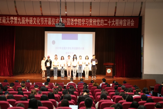 4月19日下午,js3333線路檢測中心第九屆外語文化節(jié)開幕式暨外國語學(xué)院學(xué)習(xí)貫徹黨的二十大精神宣講會在南區(qū)大學(xué)生活動中心如期舉行。外國語學(xué)院黨委書記李榮華、校黨委學(xué)生工作部副部長俞立峰、校團委副書記楊飏、學(xué)院黨委副書記劉伯賢、“振初琴華獎學(xué)金”捐贈代表陳志鋼、學(xué)院英語系主任孫志祥、日語系主任張鵬、學(xué)院關(guān)工委常務(wù)副主任鮑國慶、關(guān)工委委員吳艷敏、學(xué)院分團委書記陸芳及輔導(dǎo)員、班主任老師出席本次活動,相關(guān)學(xué)院學(xué)生代表以及我院500余名學(xué)生參會。