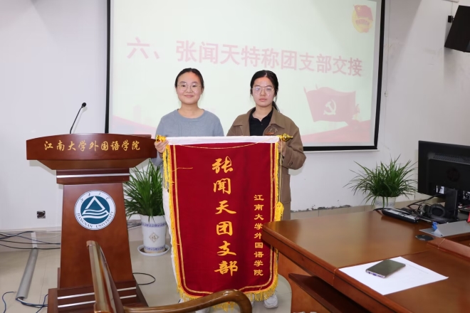 上一屆“張聞天特稱團支部”英語1904團支書蓋文靜對過去兩年的團支部建設進行回顧展示。新當選的“張聞天特稱團支部”英語2101團支書柏晶文接過錦旗,表示將認真學習、踐行張聞天精神,將特稱團支部的優良傳統進一步傳承與發揚。